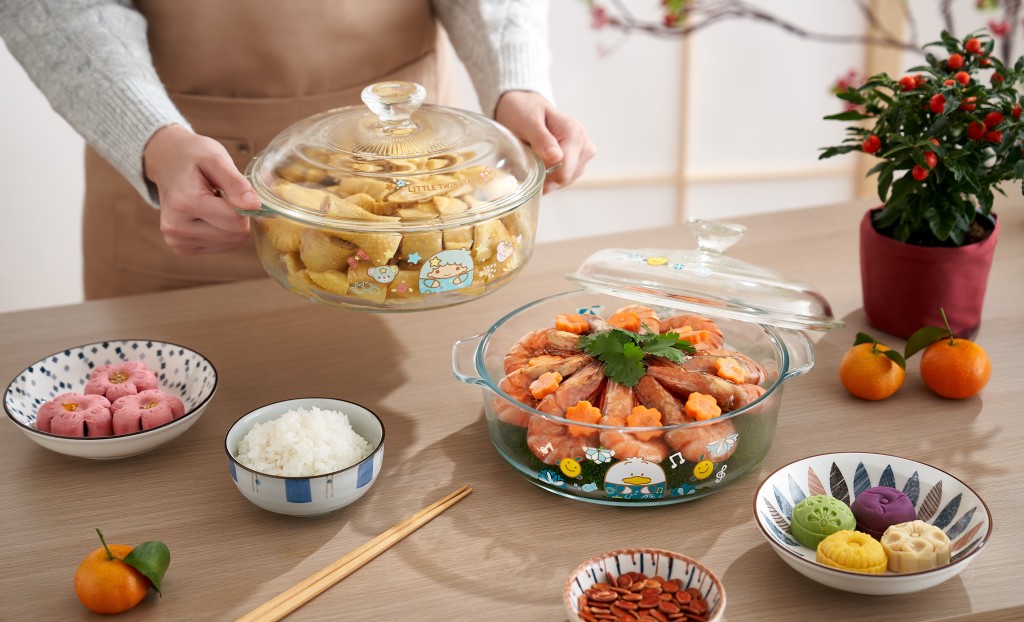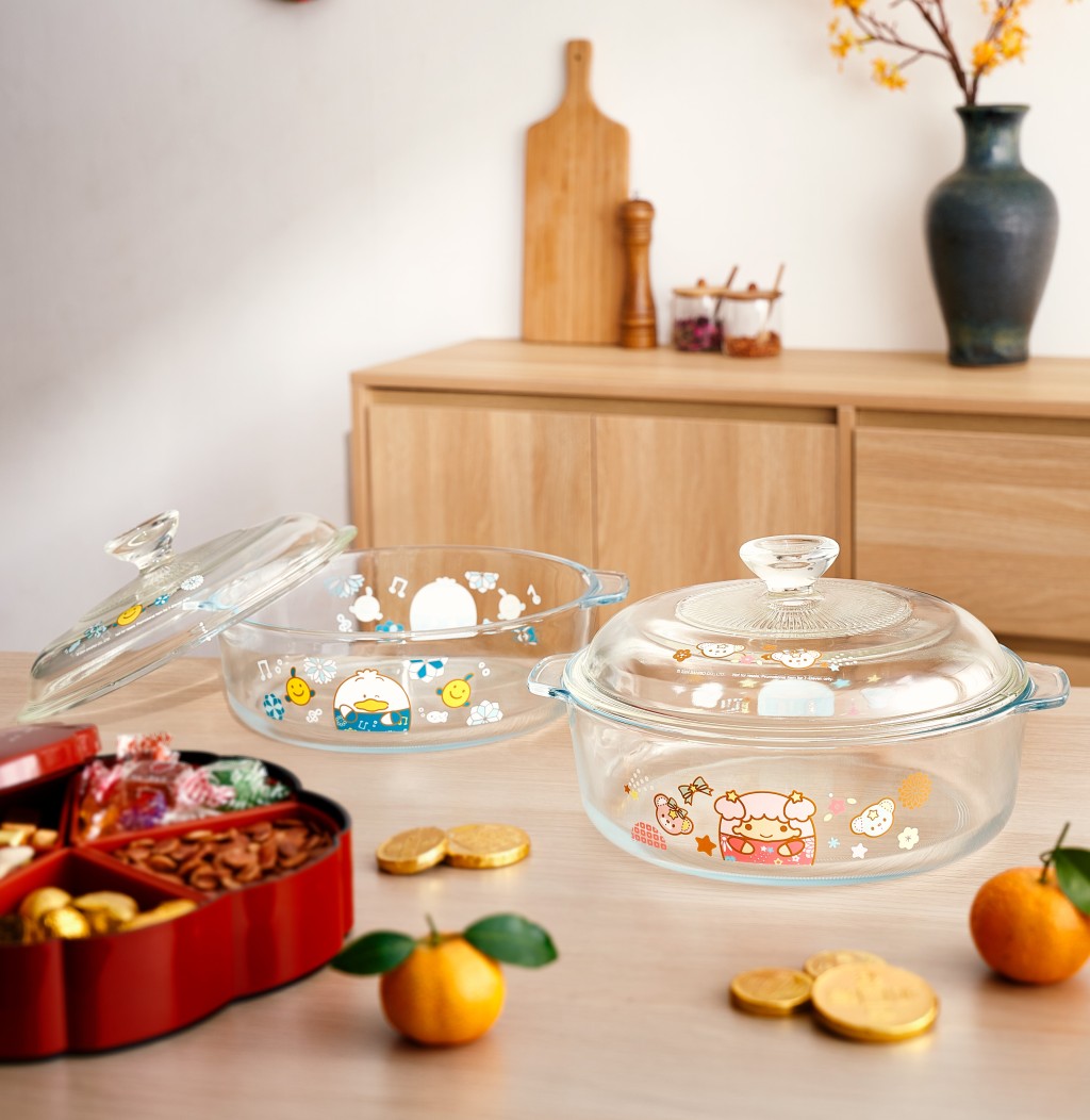兩款“滿載祝福玻璃盤”以天天都糖黐豆的 Little Twin Stars 和雪白又可愛的 Ahirunopekkle (AP鴨)作為主角,圓滾滾的造型更顯活潑和淘氣的一面!“Little Twins Stars 滿載祝福玻璃盤”一面印有Kiki頭像,另一面則印有LaLa頭像,更有二人的好朋友Puff和Poff同框,粉色設(shè)計加上碎花及星星圖案,夢幻又實用!而另一款“Ahirunopekkle滿載祝福玻璃盤”則以藍色為主調(diào),兩面印有不同表情Ahirunopekkle和其好朋友小魚 Pitchi的頭像,配上藍白小花圖案更添淘氣!圓形的“滿載祝福玻璃盤”采用以Borosilicate玻璃制造,耐冷耐熱,可以直接放入微波爐、焗爐加熱使用(蓋除外)!玻璃焗盤耐受溫度為0°C-180°C,容量約2升,適合在新春時用來制作年糕、蘿卜糕,或者盛載盆菜、撈起等!配上玻璃蓋設(shè)計,可更方便保儲食物,玻璃盤更通過美國FDA要求,一家大小都可以安心使用。