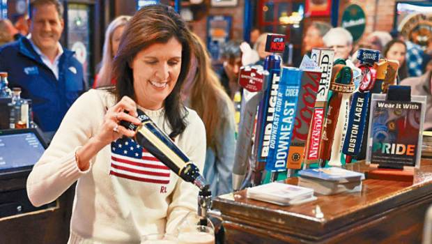 黑利上周六在新罕布什爾州一間酒吧拉票時(shí),倒啤酒入酒杯。