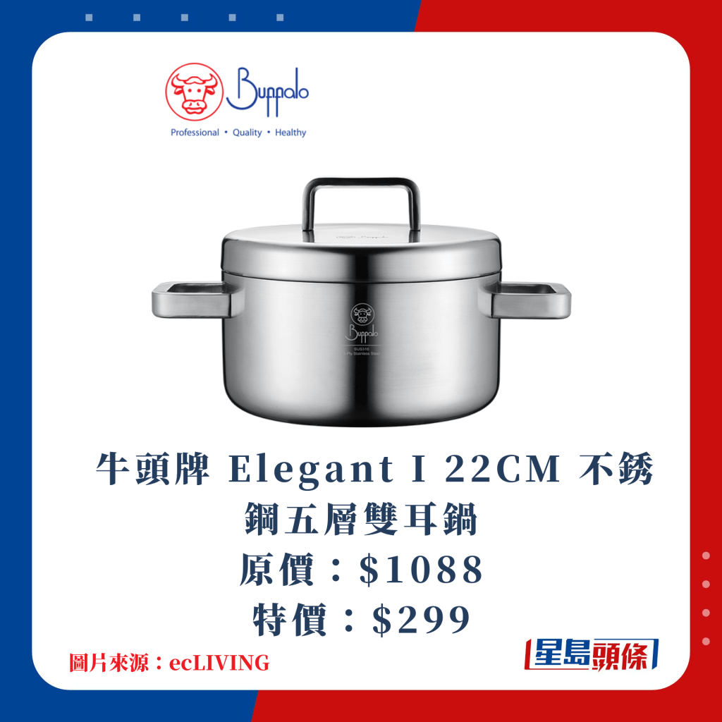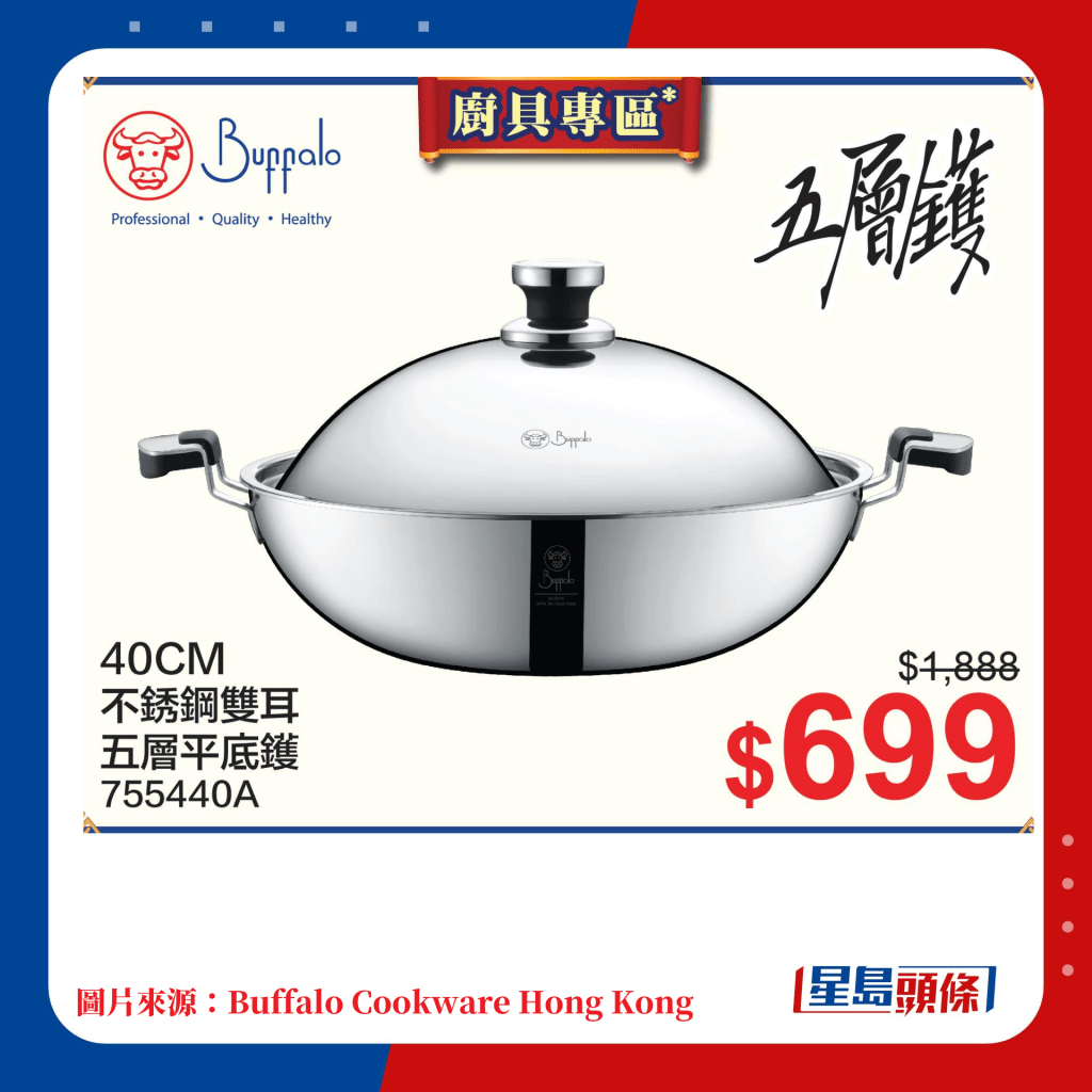 BUFFALO一向深受主婦歡迎,今次開倉全場貨品低至2折,每周設(shè)不同限量限售貨品,買滿指定金額,更可免費獲贈指定贈品1份。 當(dāng)中不乏不銹鋼系列廚具,包括五層鍋、五層煲、加厚底煲、雙耳煲等,易于清潔打理。 最抵買必數(shù)不銹鋼煎鍋低至$169,想添置抵買煮食鍋具,為家人煮一頓豐富的團年飯就最適合不過!