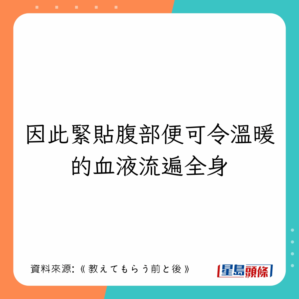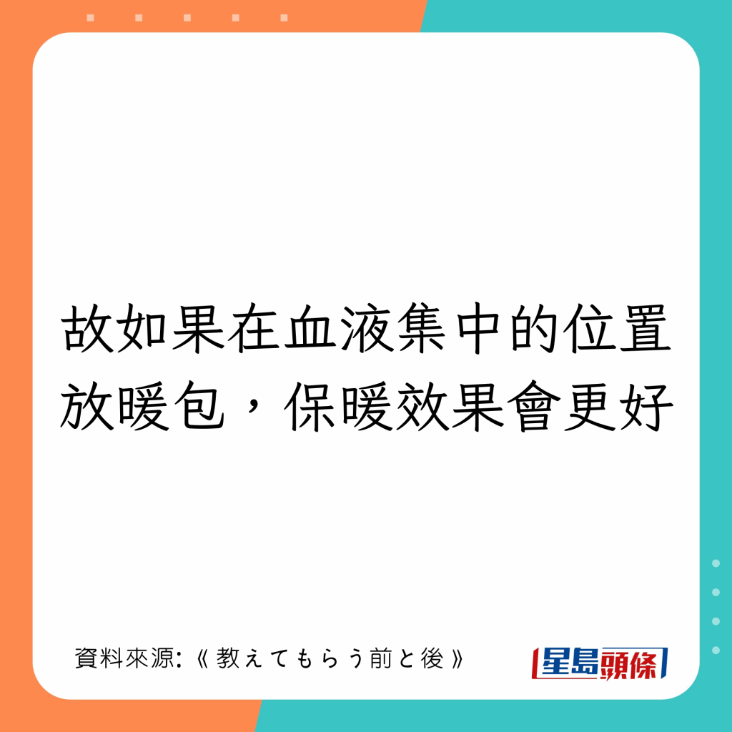 如何用暖包發(fā)揮才最大效用? 專家亦指出,暖包的擺放位置亦會影響保暖效果,若按以下做法,則有助促進身體血液循環(huán),令全身更暖: