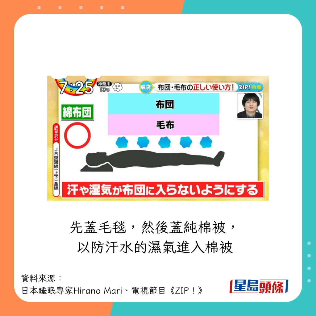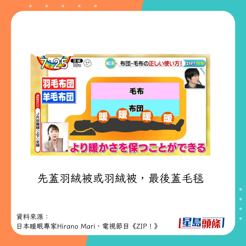 日本電視節(jié)目《ZIP! 》曾訪問睡眠專家ヒラノマリ(Hirano Mari),講解4種常見被子的特性,并教如何蓋被才最“暖笠笠”。