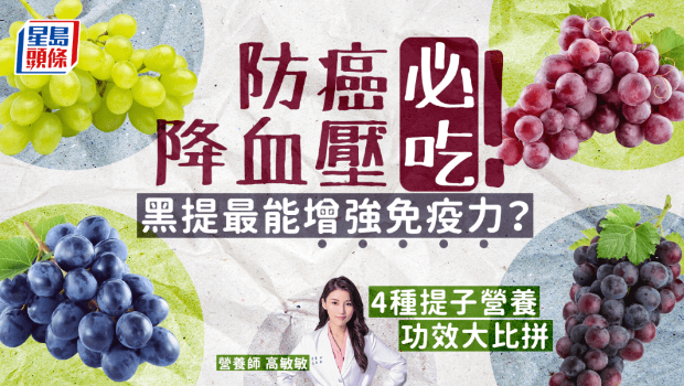 水果營(yíng)養(yǎng)豐富,提子(葡萄)是深受港人歡迎的水果之一。有營(yíng)養(yǎng)師指,不同顏色的提子營(yíng)養(yǎng)價(jià)值大不同。青提、黑提,紅提等,哪一種提子最有益?吃提子可防癌、降血壓?想改善免疫力吃黑提最有效?
