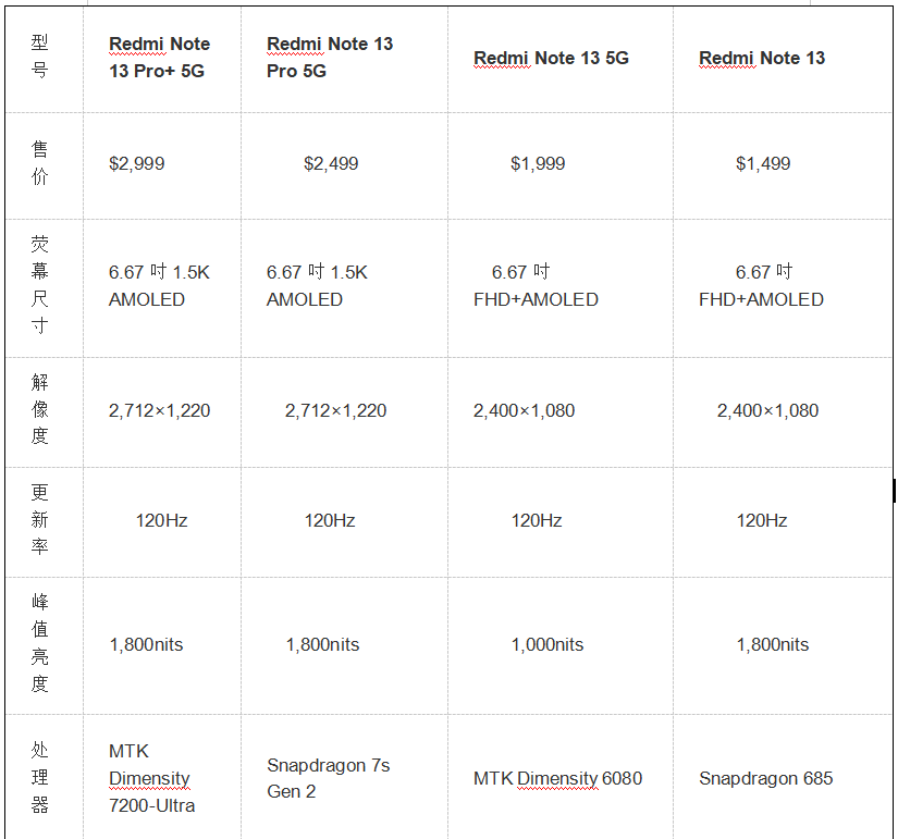 Redmi Note 13系列規(guī)格比較