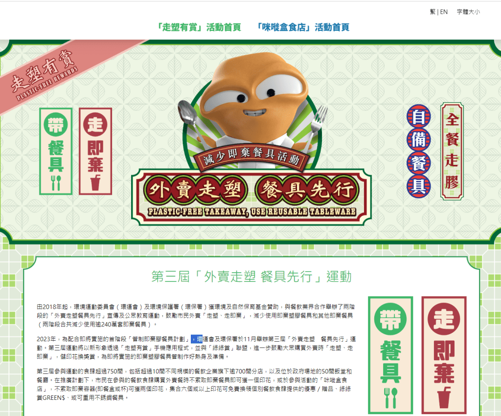 ▲環(huán)境運(yùn)動(dòng)委員會(huì)及環(huán)保署于去年11月舉辦第三屆外賣走塑餐具先行運(yùn)動(dòng)。走塑有賞網(wǎng)頁截圖