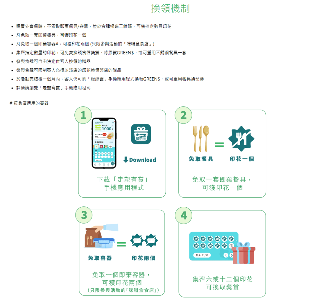 環(huán)境運(yùn)動(dòng)委員會(huì)及環(huán)保署于去年11月舉辦第三屆「外賣走塑餐具先行」運(yùn)動(dòng),透過「走塑有賞」手機(jī)應(yīng)用程序,巿民購買外賣時(shí)「走塑、走即棄」,便可儲(chǔ)印花換獎(jiǎng)賞。 走塑有賞網(wǎng)頁截圖