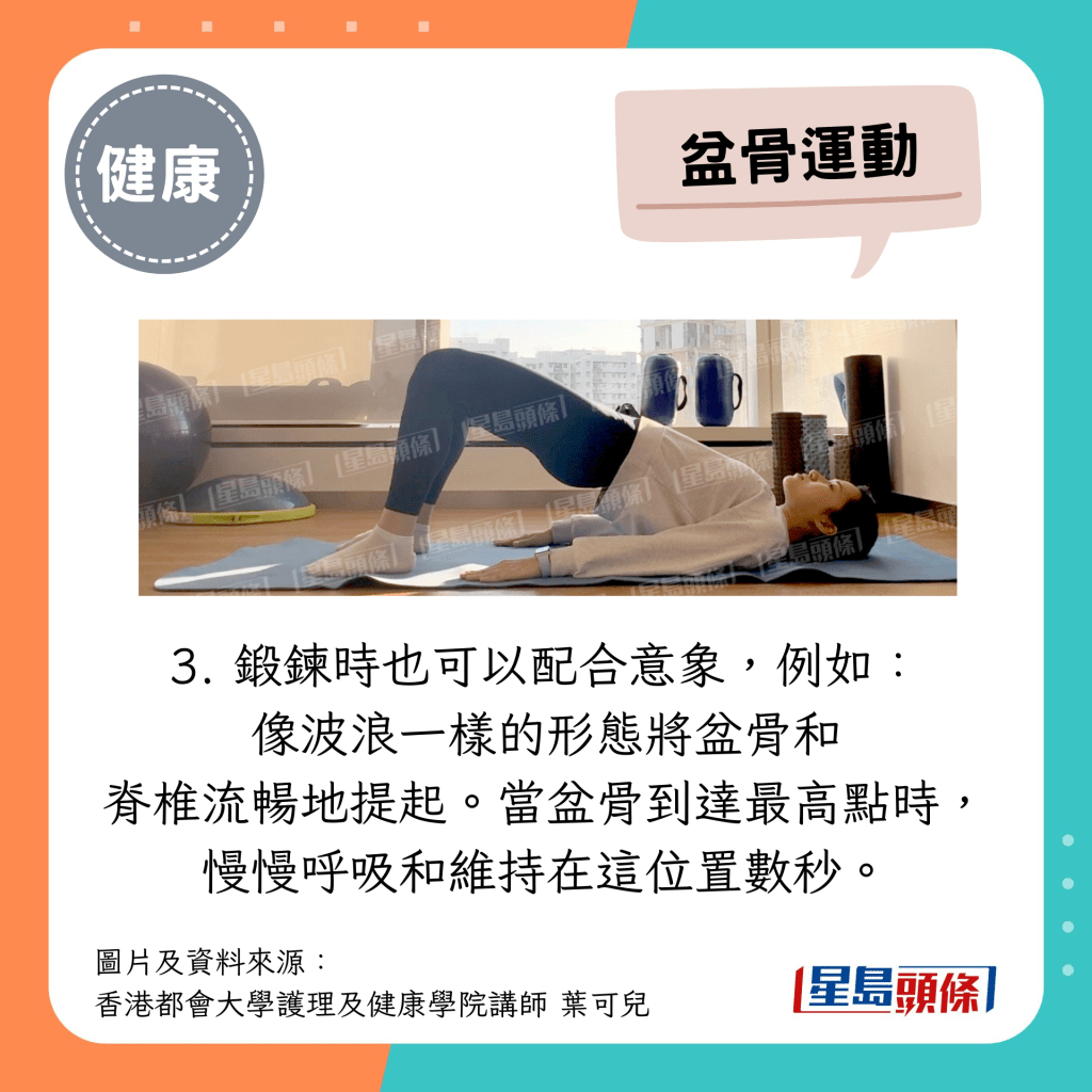 鍛煉時(shí)也可以配合意象,例如:像波浪一樣的形態(tài)將盆骨和脊椎流暢地提起。當(dāng)盆骨到達(dá)最高點(diǎn)時(shí),慢慢呼吸和維持在這位置數(shù)秒。