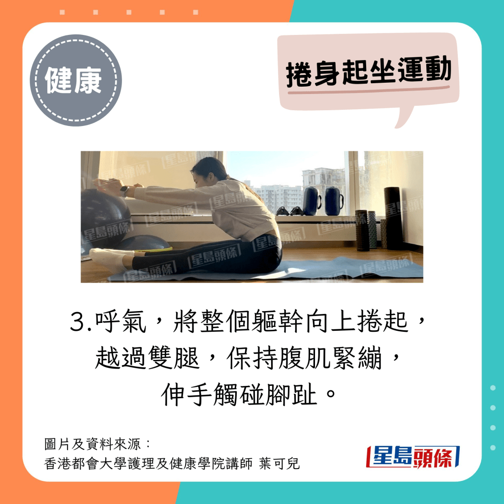 呼氣,將整個(gè)軀干向上卷起,越過(guò)雙腿,保持腹肌緊繃,伸手觸碰腳趾。