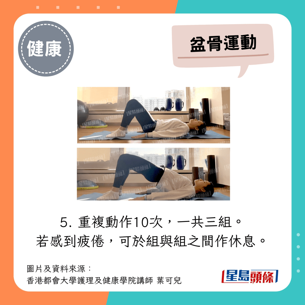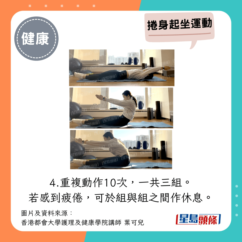 重復(fù)動(dòng)作10次,一共三組。 若感到疲倦,可于組與組之間作休息。