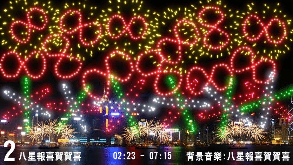 8幕煙花分別為龍騰虎躍、八星報(bào)喜賀賀喜、繁花似錦江南美、家在香港、未來我來、我鐘意、You Raise Me Up 及豐收鑼鼓,當(dāng)中有不少寓意吉祥喜慶的煙花效果。第二幕“八星報(bào)喜賀賀喜”,空中放出“金色 8 字”及“紅色 8 字變爆裂”的造型禮花彈,寓意廣大市民財(cái)源滾滾,更有嶄新的“五彩乾坤球”呈現(xiàn)夜空,祝賀市民時(shí)來運(yùn)轉(zhuǎn);第六幕“我鐘意”則會(huì)出現(xiàn)“笑臉”、“雙紅心”,提醒巿民要學(xué)懂放松,做鐘意的事;而第八幕“豐收鑼鼓”則綻放出“金元寶”及“千輪金雨”造型煙花,希望巿民今年賺個(gè)盆滿缽滿,最后,“特大錦冠”造型煙花在最后 30 秒密集式發(fā)放祝愿祖國(guó)繁榮昌盛,國(guó)泰民安,全港市民安居樂業(yè),龍馬精神!