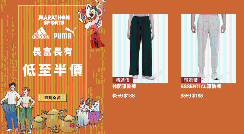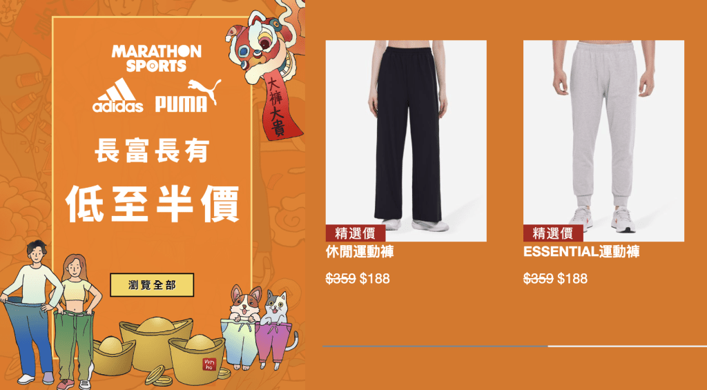馬拉松網(wǎng)店“新年開運購物祭 Luna New Year Sale”特價品牌包括 ASICS、Adidas、New Balance、Skechers、Columbia、Birkenstock、Under Armour、The North Face、Mizuno 以及Marathon Sports 自家品牌,囊括球鞋、跑鞋、運動褲、運動衫、運動內(nèi)衣、童裝球鞋、返學(xué)鞋等等。除了折扣優(yōu)惠,購買 Marathon Sports 自家品牌指定褲款,限時兩件只需 $288,搭配衛(wèi)衣兩件 $388,預(yù)祝龍年“多褲多富”、“長富長有”。