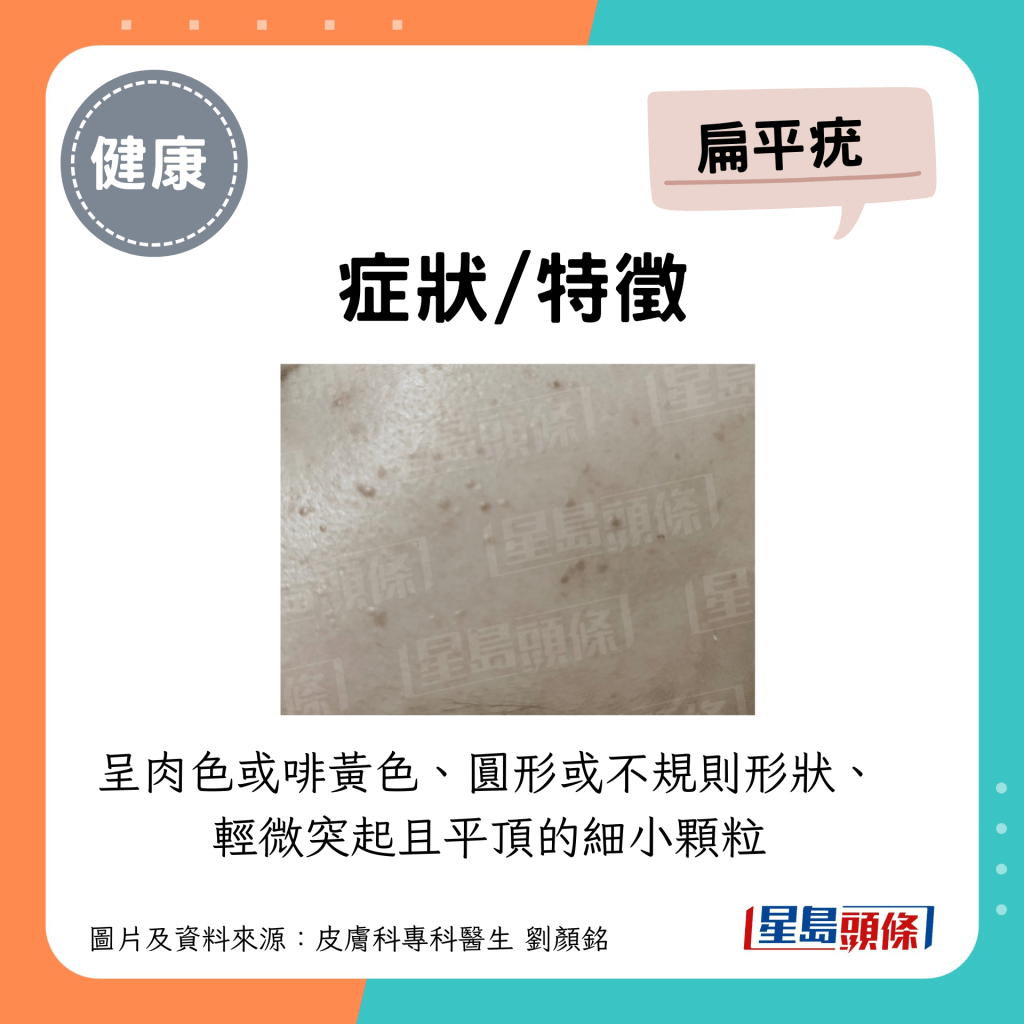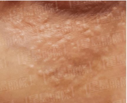 *呈肉色或啡黃色、圓形或不規(guī)則形狀、輕微突起且平頂?shù)募?xì)小顆粒;約1至4毫米,可以不均勻分散出現(xiàn)或數(shù)粒聚在一起。