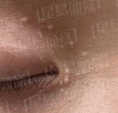 *呈珍珠白或黃白色、輕微突起的圓形細(xì)小顆粒,約1至2毫米,形態(tài)像白頭粉刺,可分散單個(gè)出現(xiàn)或數(shù)粒聚在一起。