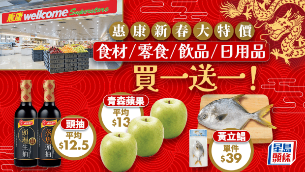 惠康超級(jí)市場(chǎng)為慶祝農(nóng)歷新年的到來,推出大量“雙喜臨門”快閃優(yōu)惠,多種食材、零食、油、紙巾、飲品等商品買一送一,非常抵買! 另外,除了買一送一優(yōu)惠,亦同期推出其他折扣優(yōu)惠,閱讀下文即睇所有惠康新年激抵推廣!