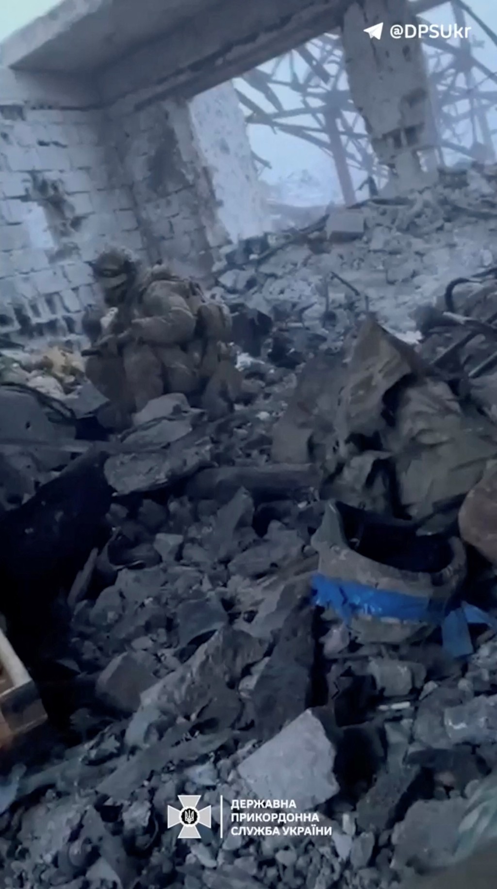 烏克蘭士兵坐在幾乎全毀的建筑物瓦礫中。 路透社