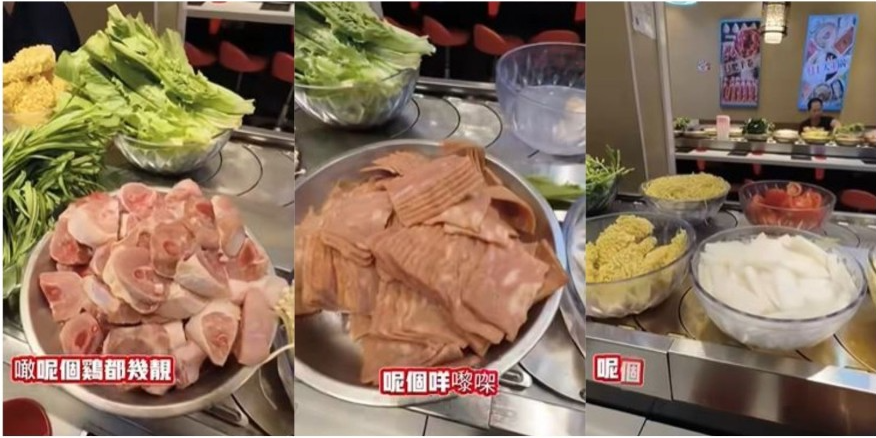 片段可見火鍋食材采用回轉(zhuǎn)形式運送,種類繁多,供應(yīng)蘿卜、即食面、雞件、蔬菜、腸仔、豆腐等等。