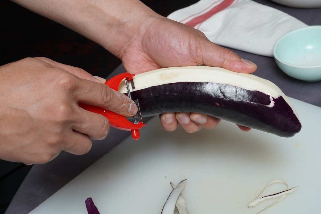 1. 茄子刨皮、切件及去籽,略為浸水。