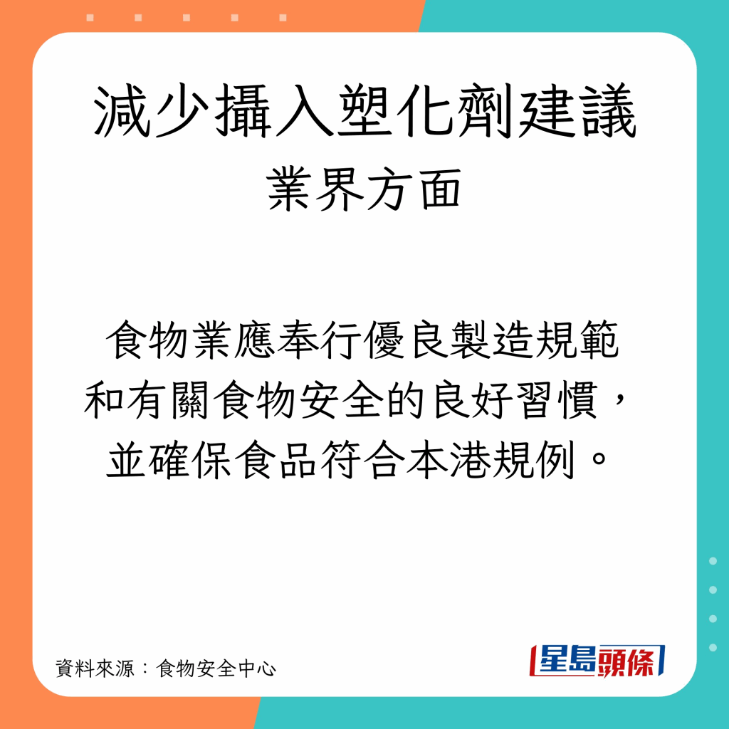 香港食安中心指,塑化劑是廣為使用的工業(yè)化學(xué)物。由于塑化劑廣泛存在于環(huán)境中的污染物,我們無可避免會(huì)透過食物、水或皮膚與塑膠接觸等不同途徑攝入小量塑化劑。不過,人體可有效代謝和排出鄰苯二甲酸酯等塑化劑,攝入小量鄰苯二甲酸酯不會(huì)影響健康。食安中心列出6大建議,教大眾盡量減少從食物攝入塑化劑: