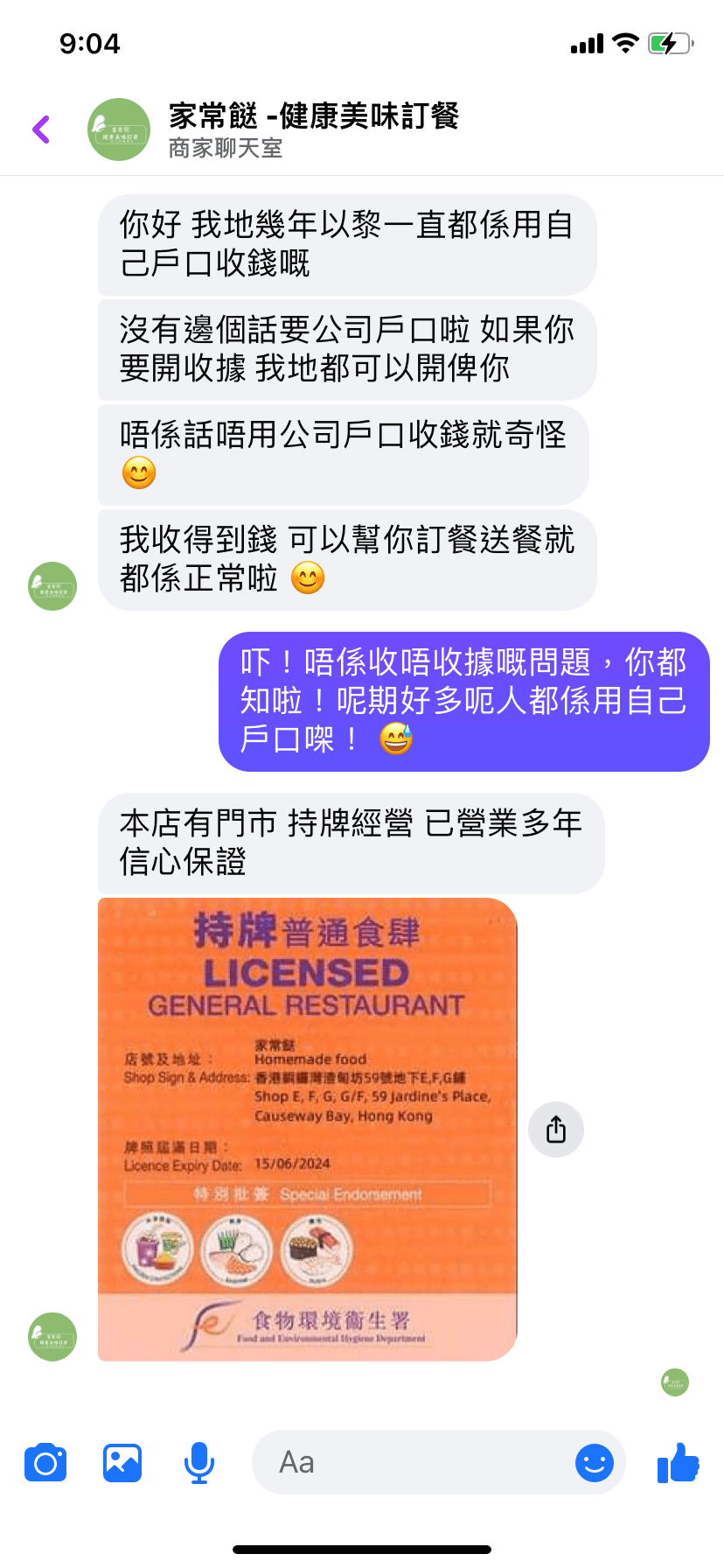 《星島申訴王》發(fā)現(xiàn)Facebook有一些類似馮先生所提供的兩餸飯專頁,故放蛇嘗試聯(lián)絡(luò)專頁。記者問專頁是否幾多份餐或不論地區(qū)都可以送餐,對(duì)方全都有求必應(yīng),只需要提前一日過數(shù),翌日便會(huì)提供餐單選餐;當(dāng)記者提供了份數(shù),送貨地點(diǎn)之后,對(duì)方便提供一個(gè)銀行戶口請(qǐng)記者過數(shù),當(dāng)記者再三質(zhì)疑后,對(duì)方便稱自己有門市,而且持牌經(jīng)營(yíng)多年,最后便發(fā)來一張與馮先生收到一樣的食肆牌照。