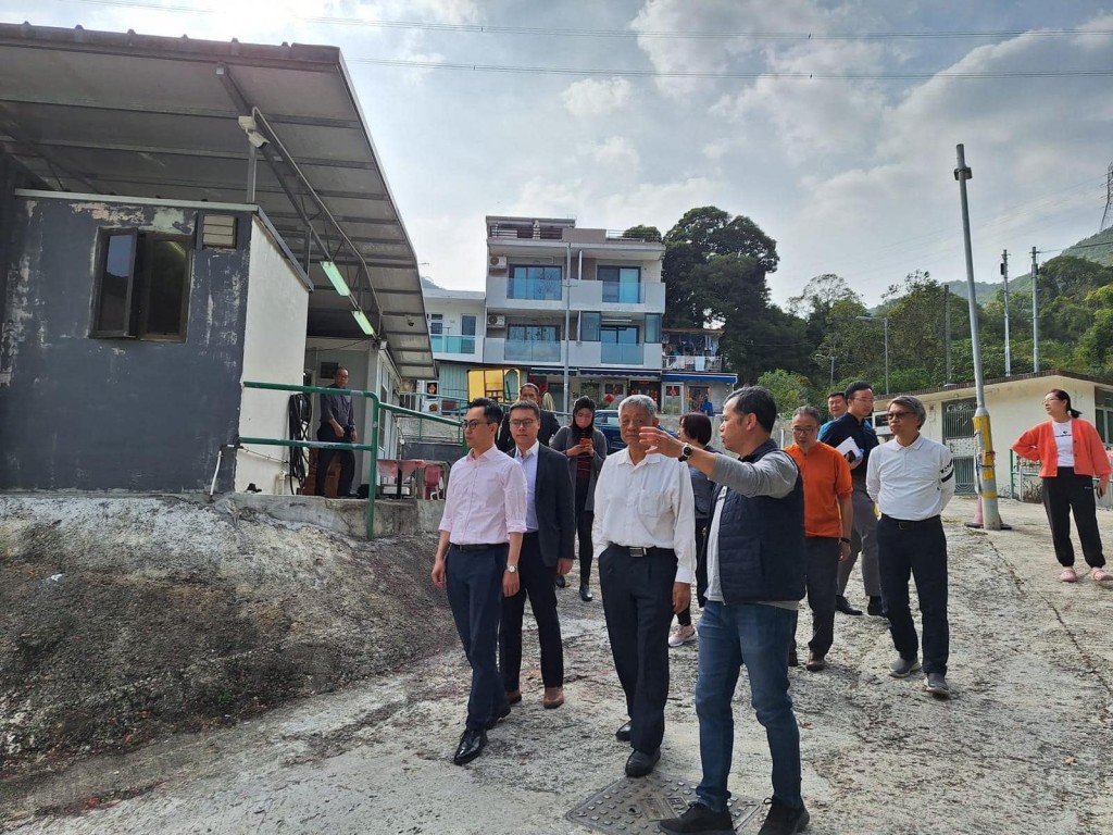 ▲沙田民政專員余懷誠(白恤衫戴黑框眼鏡者)連同運輸署代表及小巴營運商到黃竹洋村視察實況。(民政事務(wù)總署fb)