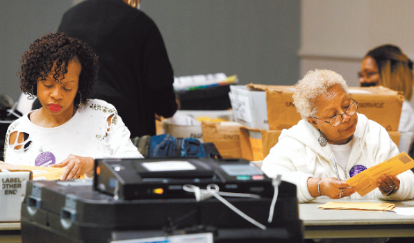 ▲密歇根州初選27日舉行,選情備受關注。圖為工作人員清點票數(shù)。路透社