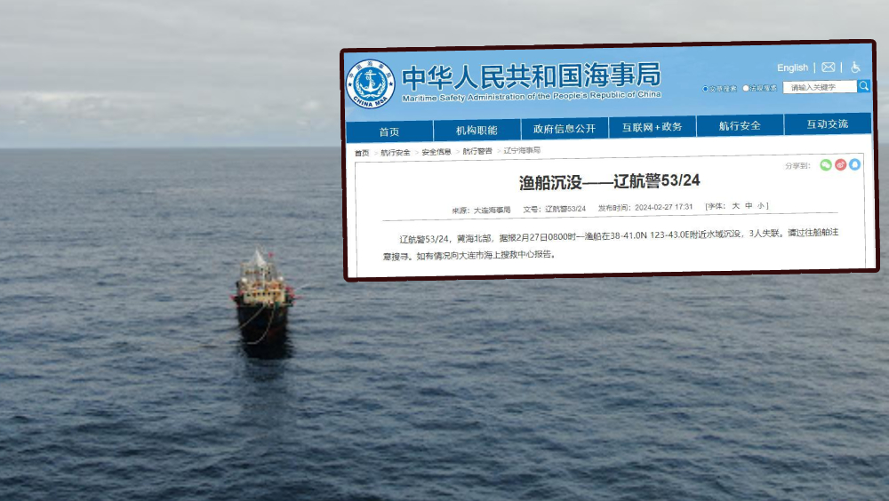 黃海北部一漁船沉沒,3人失蹤