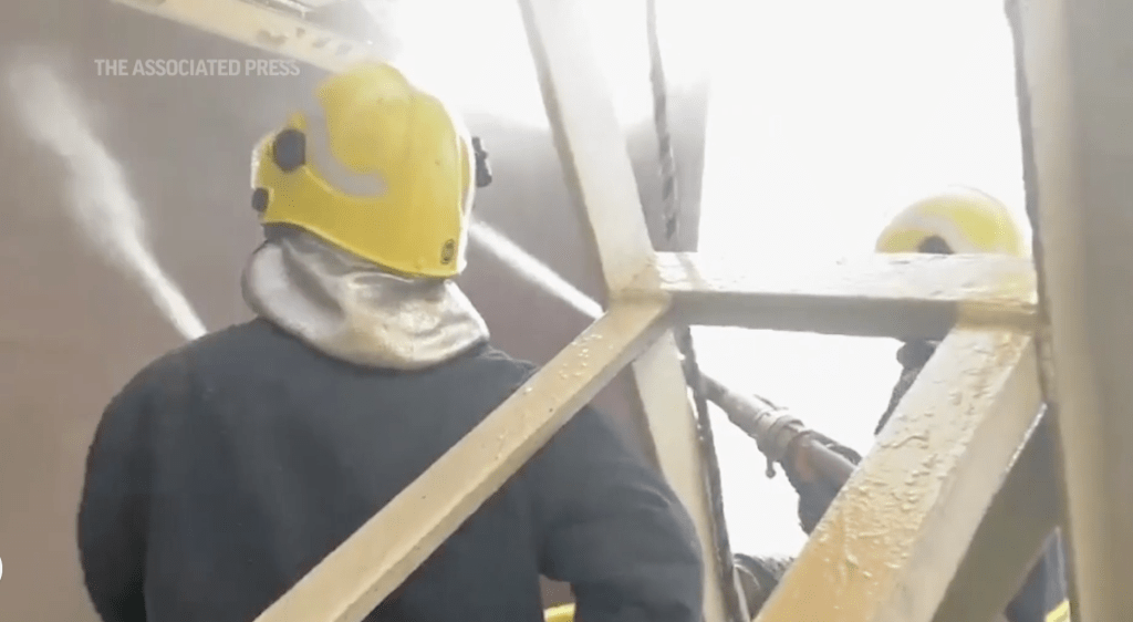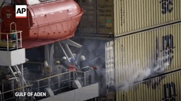 ▲船只遇襲后,船員忙于救火。 美聯(lián)社