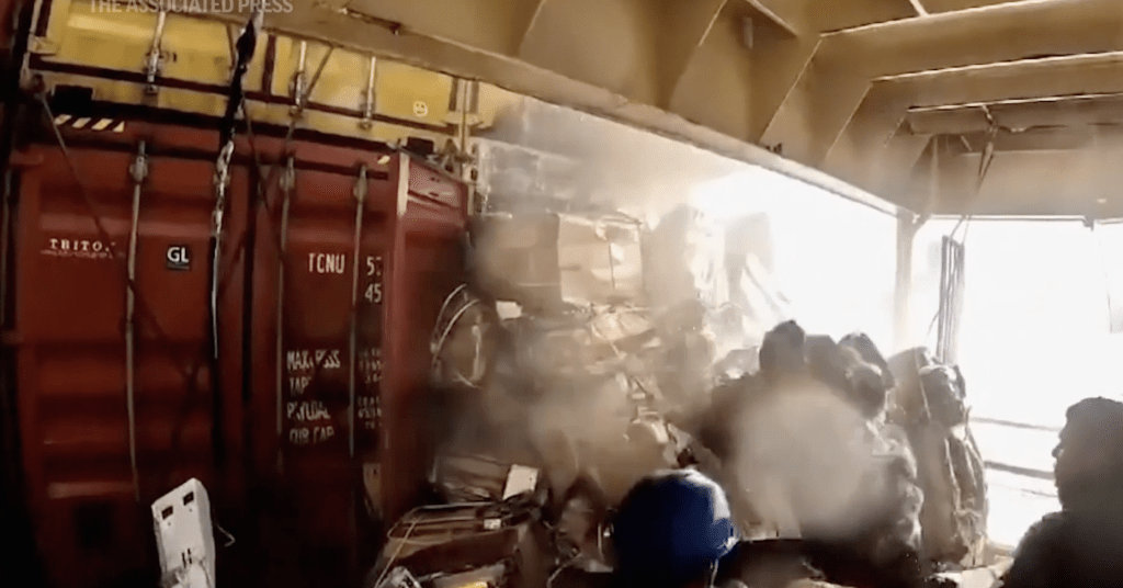 ▲貨輪被導(dǎo)彈擊中后冒火。 美聯(lián)社