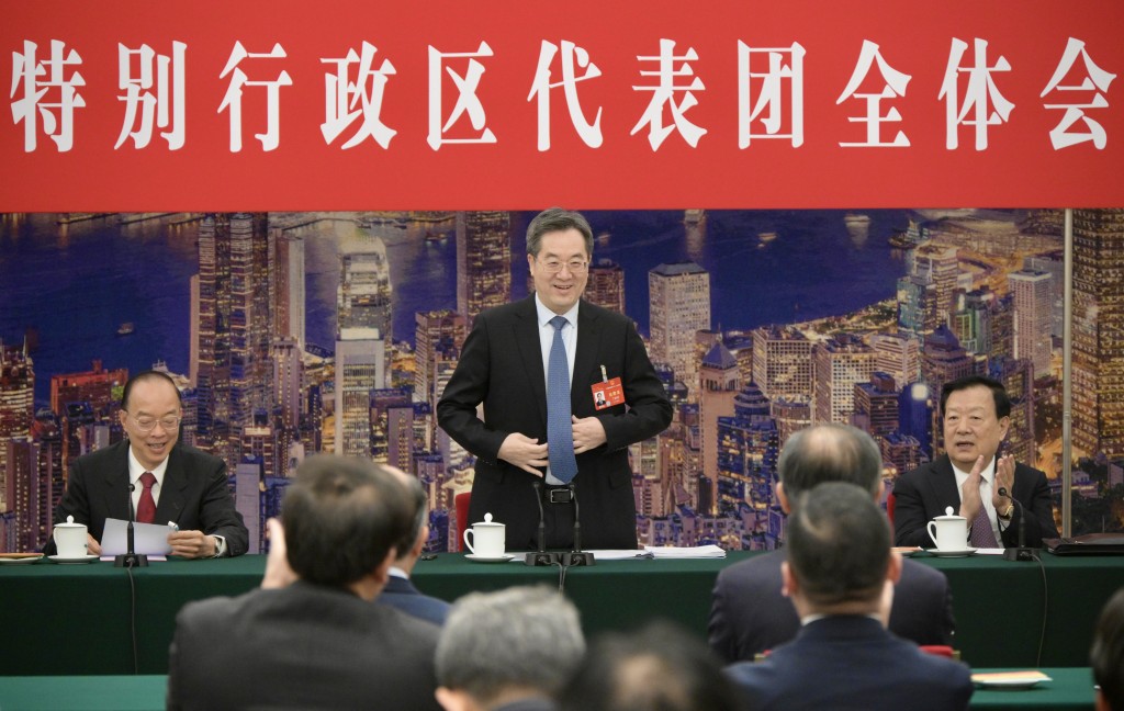 ▲丁薛祥出席港區(qū)人大代表團(tuán)會議。(蘇正謙攝)