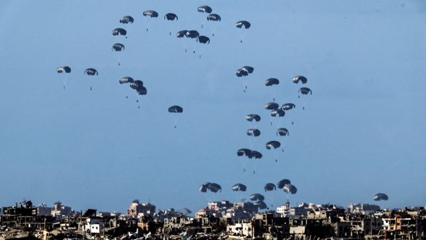 根據(jù)社交媒體上流傳的一段據(jù)稱在沙提難民營拍攝到的影片,一架飛機(jī)在加沙北部空投載有救援物資的包裹,其中至少有一個(gè)降落傘沒有正常打開,導(dǎo)致多個(gè)包裹高速砸向地面。與此同時(shí),在一片尖叫聲中,人們四散逃去。