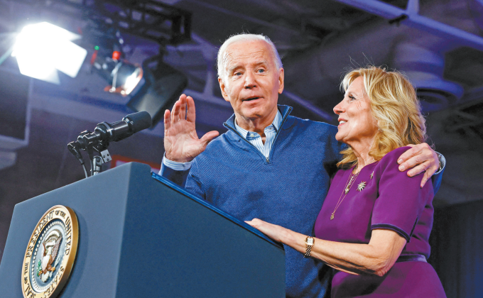 ▲總統(tǒng)拜登發(fā)表國情咨文后,到多個關(guān)鍵州份舉行造勢活動,圖為他攜同第一夫人吉爾到賓州展開拉票活動。路透社