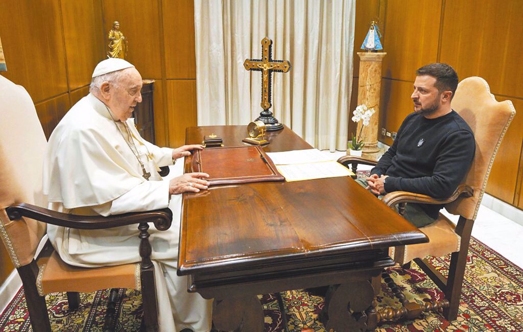 ▲天主教教宗方濟(jì)各(左)呼吁烏克蘭,應(yīng)拿出舉“白旗”進(jìn)行和談的勇氣,藉由談判尋求結(jié)束戰(zhàn)爭(zhēng)。圖為2023年5月烏克蘭總統(tǒng)澤連斯基(右)前往梵蒂岡羅馬教廷拜會(huì)教宗。