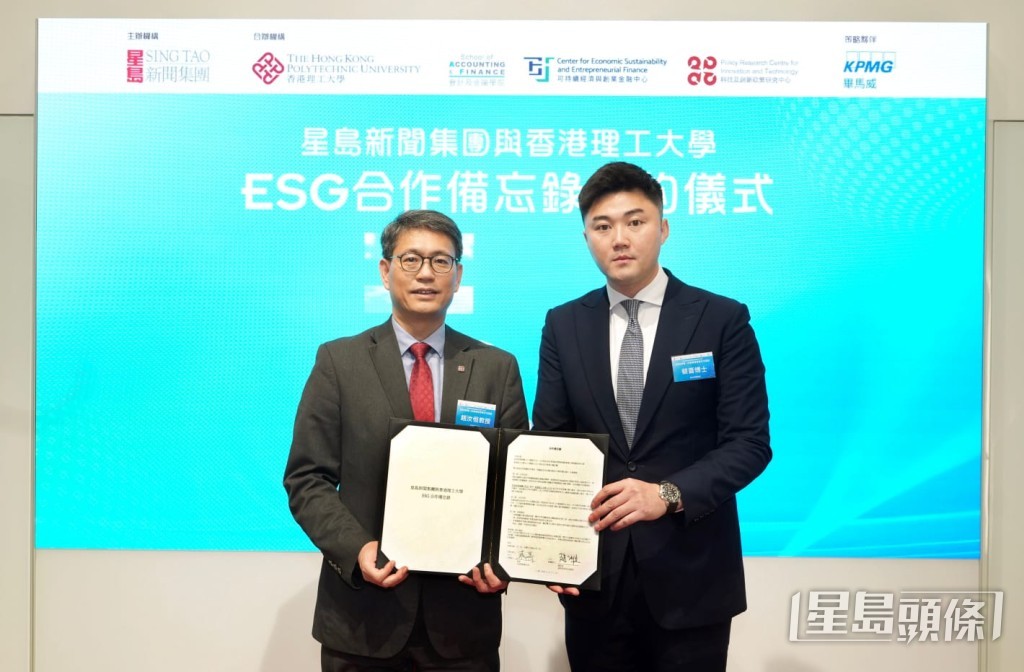 ▲星島新聞集團(tuán)與香港理工大學(xué)于ESG方面的合作再深化,星島新聞集團(tuán)行政總裁兼社長(zhǎng)蔡晉(右),以及香港理工大學(xué)副校長(zhǎng)(研究及創(chuàng)新)兼科技及創(chuàng)新政策研究中心主任趙汝恒(左),代表簽訂合作備忘錄。