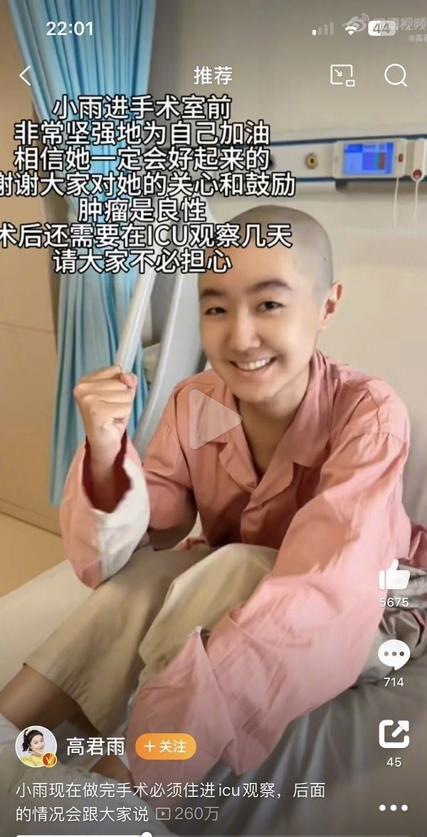 2月29日晚間,高君雨在社交平臺發(fā)片,稱她因患罕見腦瘤將接受手術(shù),并記錄了自己在手術(shù)前剃光頭的過程。