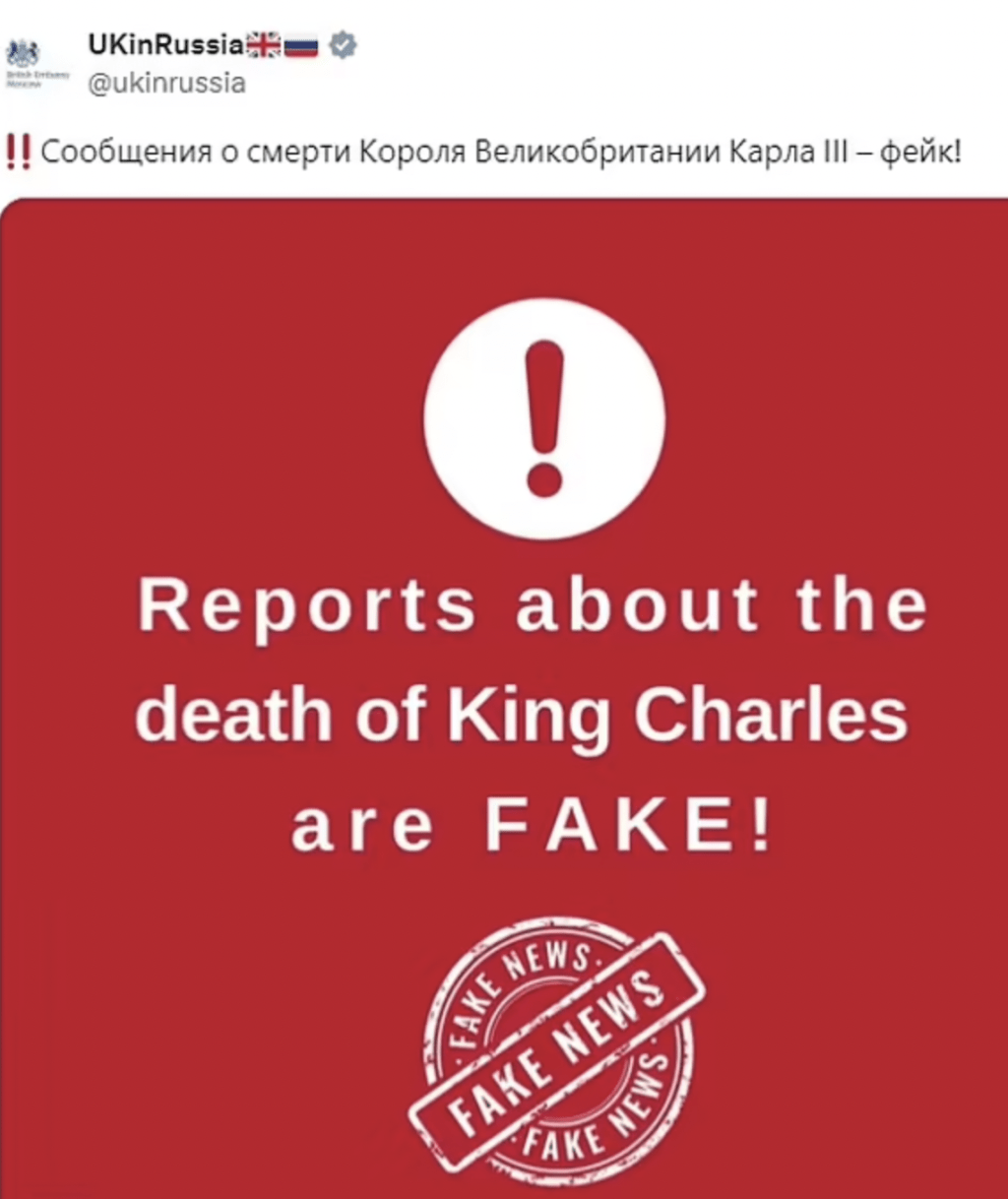 ▲英國駐俄羅斯大使館在社交平臺專頁以英語和俄語澄清,有關(guān)查爾斯已死的報道全屬虛假。