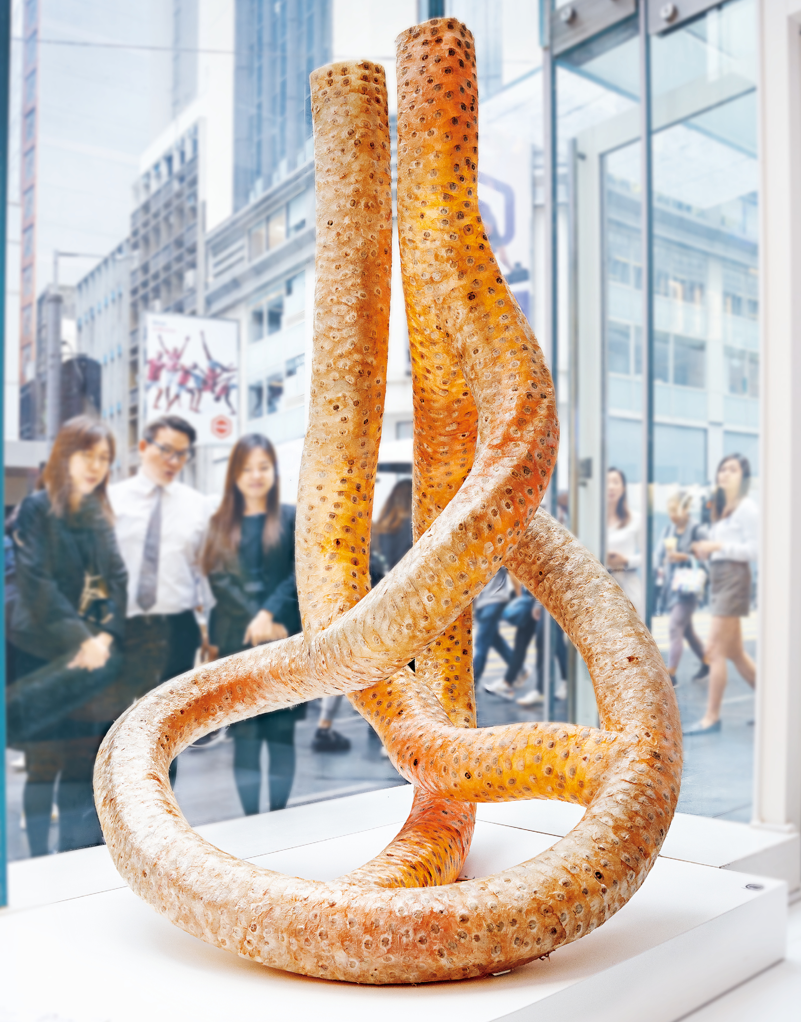 細看作品,雕塑由藥用樹材——木蝴蝶種子拼貼而成,當木蝴蝶果實成熟時,劍一樣的豆莢懸掛在光禿禿的樹枝上,當豆莢裂開,帶著薄衣翅膀的圓形種子隨風飄散,就像翩翩起舞的蝴蝶。作品為傳統(tǒng)中藥和工藝結(jié)合提出了新的可能性,為這一古老的知識賦予了重要的現(xiàn)代詮釋。透過傳統(tǒng)與現(xiàn)代元素之間的重塑和動感交流,表達了藝術(shù)家對保護文化遺產(chǎn)和文化意義的追求。