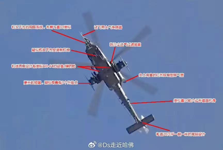 美國介紹全球最新武器裝備的《動力》(The Drive)網(wǎng)當(dāng)?shù)貢r間21日報導(dǎo),社群網(wǎng)上瘋傳的照片顯示,從仰望的視角看來,這架新型攻擊直升機(jī)如AH-64D/E般,有四方形整流罩,從機(jī)頭延伸到尾桁架。而它龐大的機(jī)身雖與目前中國軍隊已裝備標(biāo)準(zhǔn)型攻擊直升機(jī)直-10的細(xì)長機(jī)身形成鮮明對比,但它的機(jī)身仍比直-20纖細(xì)得多。分析指出,這是為了符合多數(shù)現(xiàn)代攻擊直升機(jī)典型的串聯(lián)雙座配置。