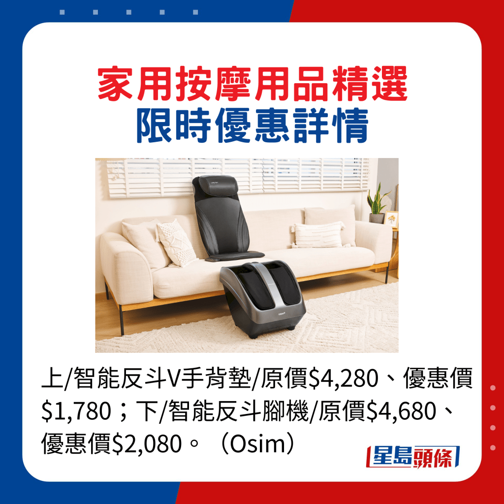 若想安坐家中隨時隨地享受按摩,可相關(guān)品牌店優(yōu)惠期間入手家用按摩產(chǎn)品。Osim為慶祝網(wǎng)店成立12周年,由即日至3月27日推出周年多重賞推廣活動,其中購買小天王2按摩椅、專為大小腿按摩的智能反斗腳機,以及智能反斗V手背墊等均有折扣,部分低至42折,如原價$21,800的小天王2按摩椅,折后一萬元以下有交易。另期間消費并輸入指定優(yōu)惠碼,全單可減$12,買滿$3,888即減$120,同時消費滿$1,212更可獲贈雙人和風玻璃杯及木托盤,抵上加抵!云集不同按摩用品的永安百貨,彌敦道店經(jīng)新裝潢后加設按摩用品專區(qū),方便選購?,F(xiàn)于永安百貨門市及網(wǎng)店指定按摩用品享折扣優(yōu)惠,其中飛利浦按摩眼罩由原價$898減至$758,惟各產(chǎn)品的優(yōu)惠期不一,看中目標就要盡快入貨。