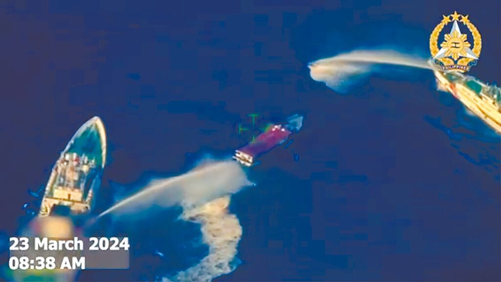 ▲菲國(guó)軍方公布的影片顯示,補(bǔ)給船Unaizah May 4在阿云金淺灘附近遭到兩艘中國(guó)海警持續(xù)的發(fā)射水炮驅(qū)趕。(摘自Armed Forces of the Philippines官網(wǎng))