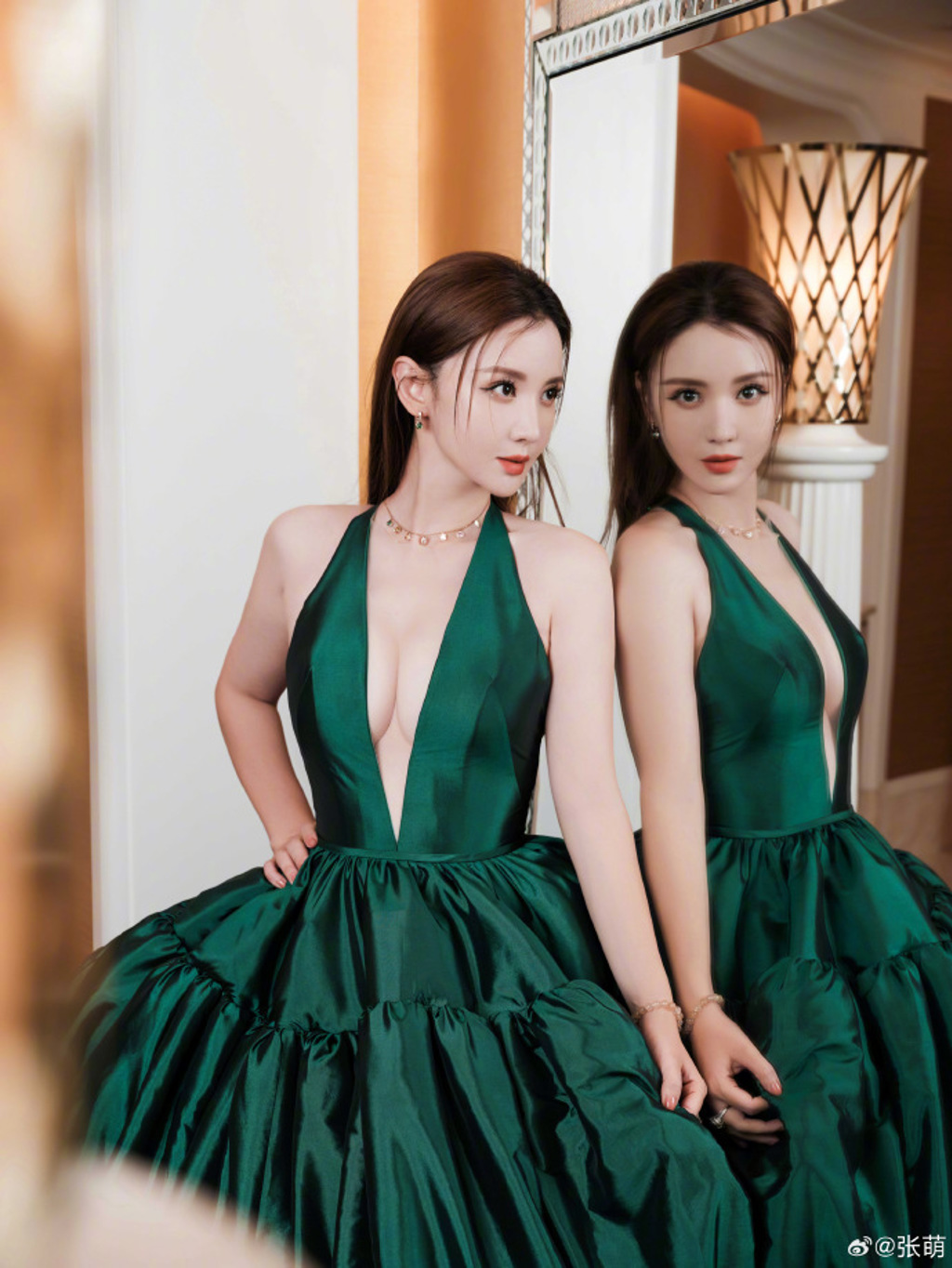 ▲張萌去年底深綠色的深V禮服造型獲得好評。(圖/張萌微博)