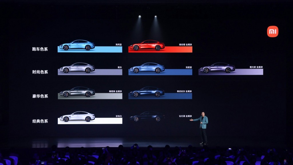 ▲除了去年底技術(shù)發(fā)布會(huì)已經(jīng)發(fā)布的三款車(chē)身顏色,雷軍現(xiàn)場(chǎng)加碼推出6款全新顏色,合計(jì)小米汽車(chē)SU7將總共推出9款車(chē)身、4款內(nèi)飾顏色。
