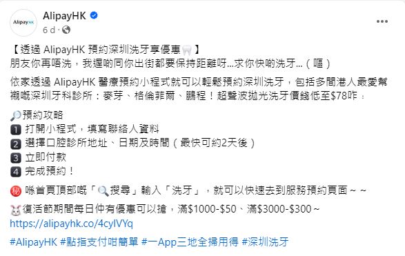 ▲AlipayHK的facebook專頁發(fā)帖,指用AlipayHK 醫(yī)療預(yù)約小程式預(yù)約深圳洗牙,函蓋的牙科診所包括麥芽、格倫菲爾及鵬程等,其中超聲波拋光洗牙價(jià)錢低至$78。