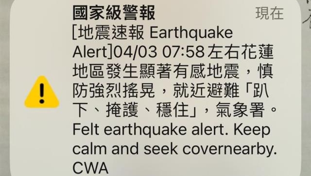 今晨臺(tái)灣大地震發(fā)生,不少網(wǎng)友在睡夢中被驚醒,據(jù)稱臺(tái)灣“中央氣象署”對(duì)12縣市發(fā)布了“國家級(jí)警報(bào)”,但不少網(wǎng)友發(fā)文“只有我沒收到‘國家級(jí)警報(bào)’嗎?”他表示,這次地震“相當(dāng)有感”,但自己卻沒收到地震警報(bào),“是不是手機(jī)更新后哪里需要調(diào)整呢?”