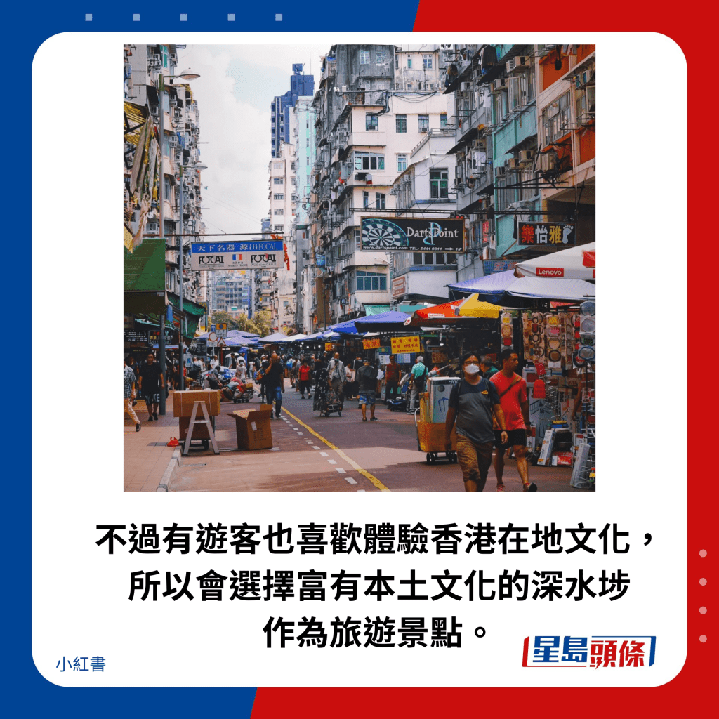 不過有游客也喜歡體驗(yàn)香港在地文化, 所以會(huì)選擇富有本土文化的深水埗 作為旅游景點(diǎn)。