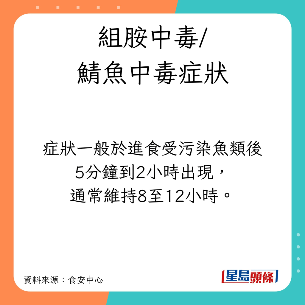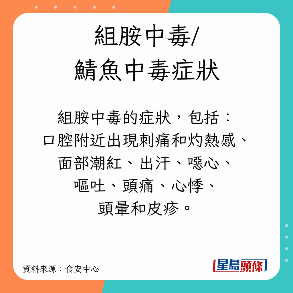 根據(jù)食安中心資料,組胺中毒又被稱為“鯖魚中毒”,由進食含大量組胺的魚類引起。涉及鯖魚中毒的魚類通常在魚類組織內(nèi)含有大量氨基酸組氨酸,其中有10種魚類較高風(fēng)險。