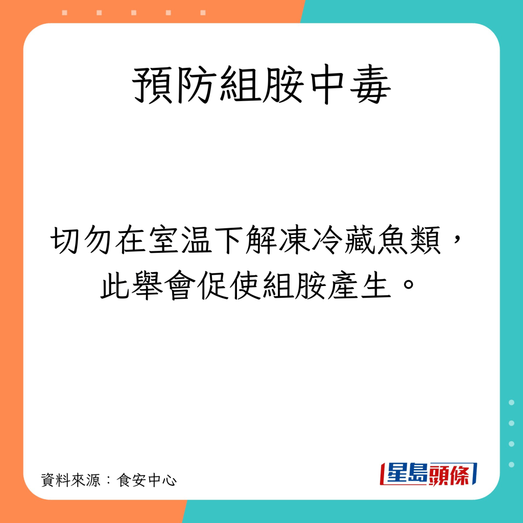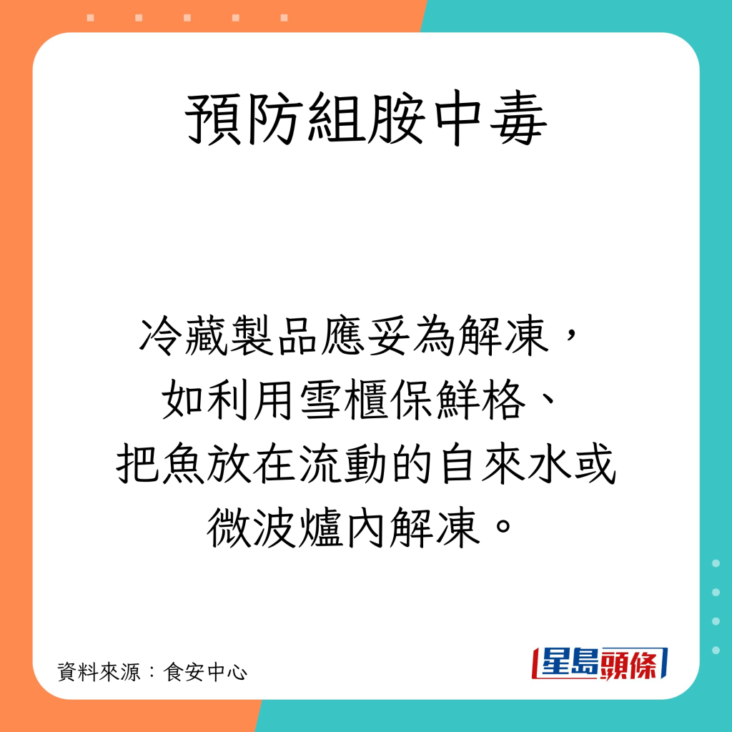 魚及魚制品長時間在不當(dāng)?shù)臏囟认绿幚砑百A存,經(jīng)過細(xì)菌的作用才會令大量的組胺形成。有1種解凍方法很易產(chǎn)生毒素,要預(yù)防組胺中毒,食安中心有以下建議: