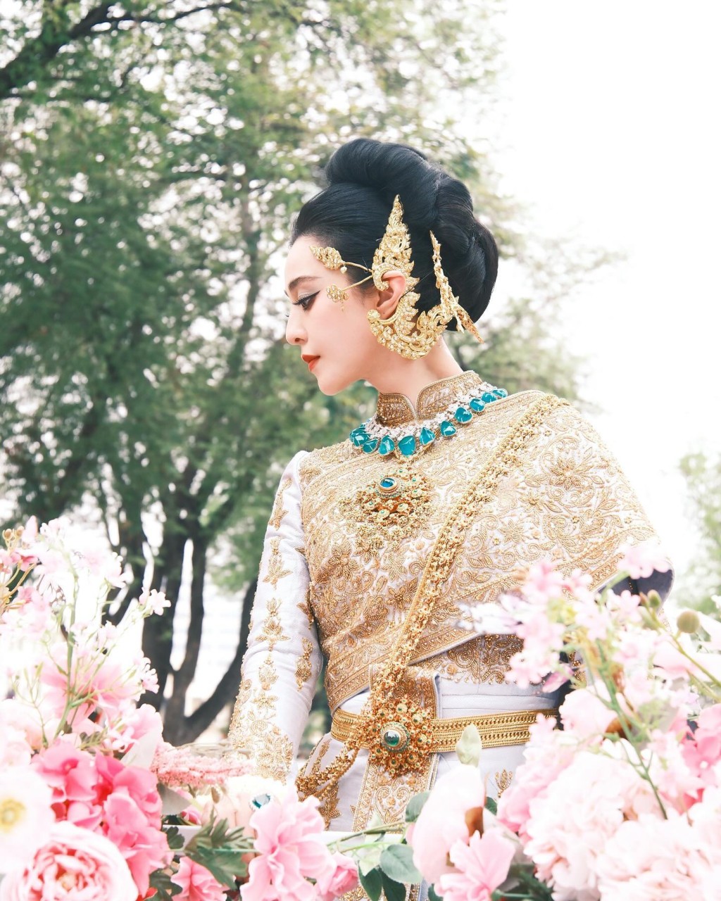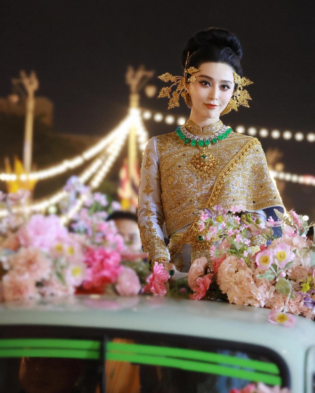 ▲照片中可見,范冰冰穿上泰國傳統(tǒng)服飾,站在車上出巡,擺出不少Pose,泰味十足。