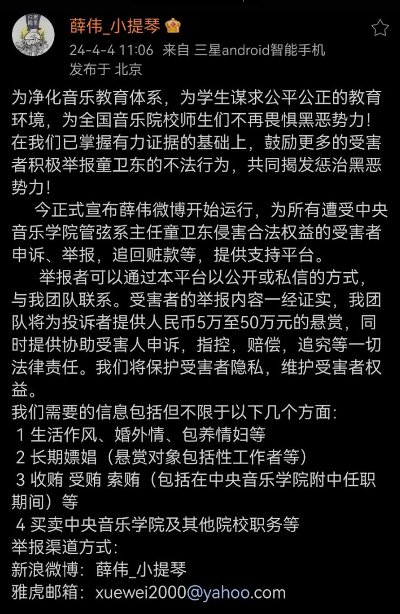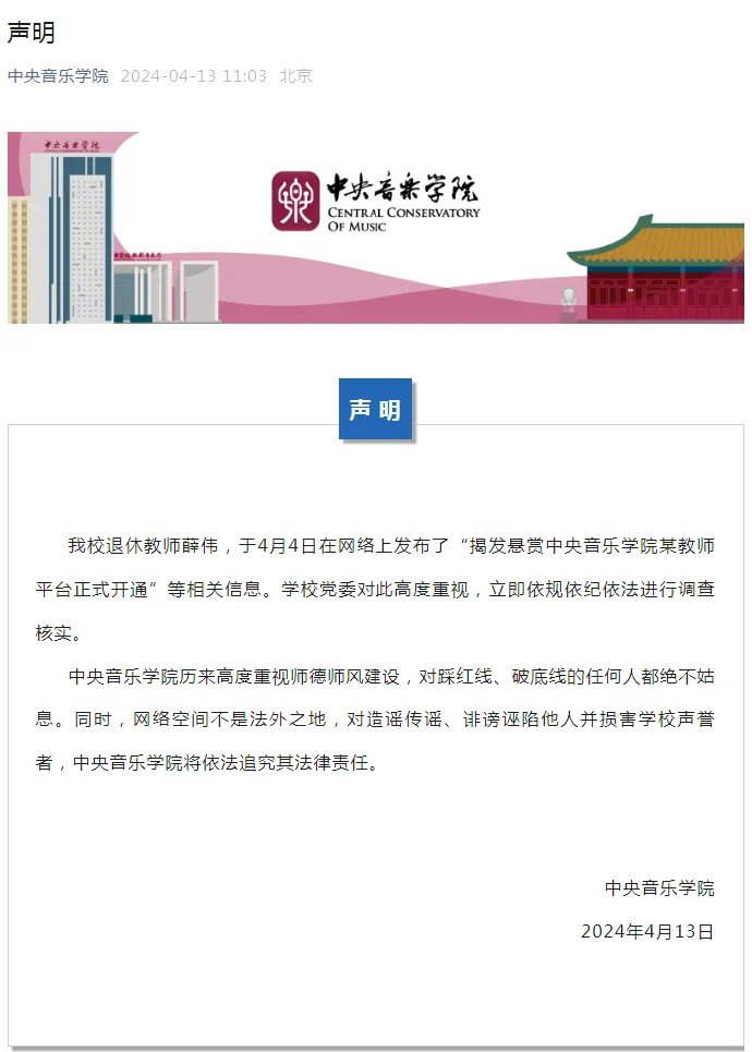 中央音樂學(xué)院官微今天發(fā)布消息:我校退休教師薛偉,于4月4日在網(wǎng)絡(luò)上發(fā)佈了“揭發(fā)懸賞中央音樂學(xué)院某教師平臺(tái)正式開通”等相關(guān)信息。學(xué)校黨委對(duì)此高度重視,立即依規(guī)依紀(jì)依法進(jìn)行調(diào)查核實(shí)。