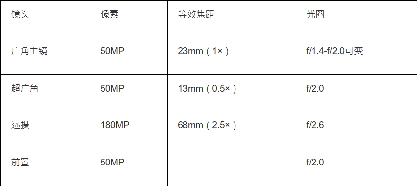 方中帶圓的3鏡組合分是50MP廣角主鏡、50MP超廣角微距及180MP遠(yuǎn)攝。