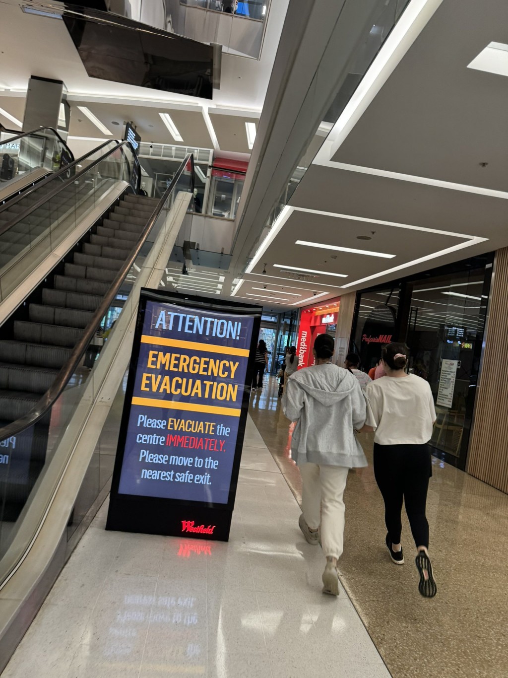 ▲商場電子資訊板大字警告民眾立即疏散。 X