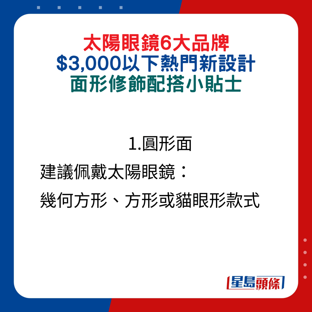 1.圓形面建議佩戴太陽眼鏡: 幾何方形、方形或貓眼形款式